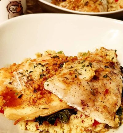 4. Put couscous salad on a bowl or a plate with dressing, and place the fish fillet on top, drizzle some lemon juice, sprinkles dry parsley and ready to serve!